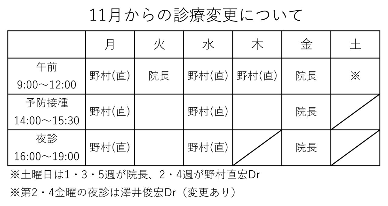 さて、3月は14日(金)の午前の診察と午後の予防接種が野村直宏Dr、14日(金)と28(金)の夜診は澤井俊宏Drが担当です。さらに、4月からは毎週水曜日の午前の診察と午後の予防接種が野村直宏Drの担当となります。